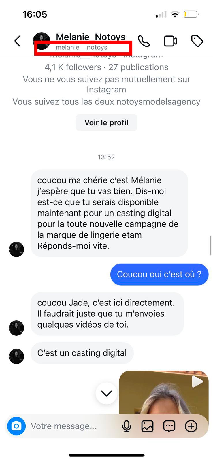 - Sur Instagram, les arnaqueurs vont jusqu’à copié intégralement les comptes des bookers ou directeurs de casting, en créant un compte avec des double lettres ou ponctuation (exemple ci-dessous).