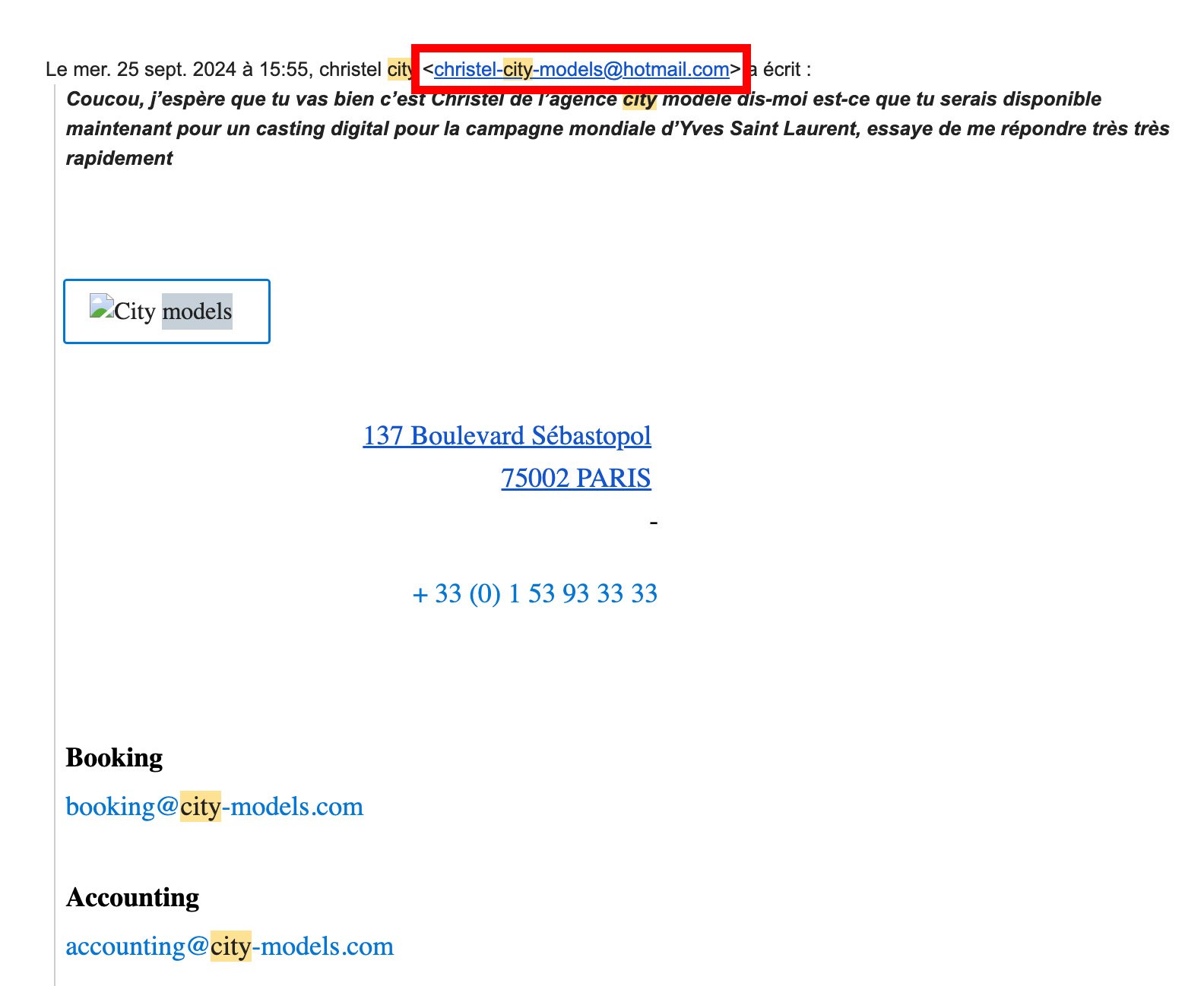 - Regardez toujours l’adresse mail ou le profil : ce n’est jamais un domaine officiel (@elitemodel.fr, etc.).